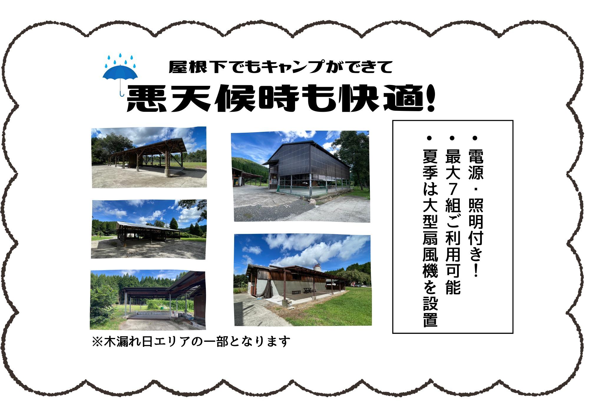 2020年5月にオープンしたばかりで牧場跡地ならではの建物も多数あり、まだまだ開拓を行なっておりエリアや施設を拡大中です! 現在は【芝生エリア】【木漏れ日エリア】【山エリア】の3つのテントサイトがあり、どのエリアも今後拡大予定で、 その他にもドックランやトレッキングコースなど様々楽しみ方をできるキャンプ場を目指し日々開拓を行なっています! 芝生エリア:10,000㎡以上の広大な平野で、初心者~上級者まで様々な方に楽しめるエリアです。南方には玖珠のシンボルの伐株山・万年山を望め、夜は満点の星空を楽しめます。 木漏れ日エリア:サイト内に木があり、木陰の下でリラックスしてキャンプを楽しめます。また、東屋(屋根がある建屋)が複数あり天候不良の時にも安心してキャンプを楽しむことができます。 山エリア:山の麓にある広い平地を利用した上級者向けのサイトで、他のエリアと少し離れた場所にあるため静かにキャンプを楽しみたい方におすすめです。