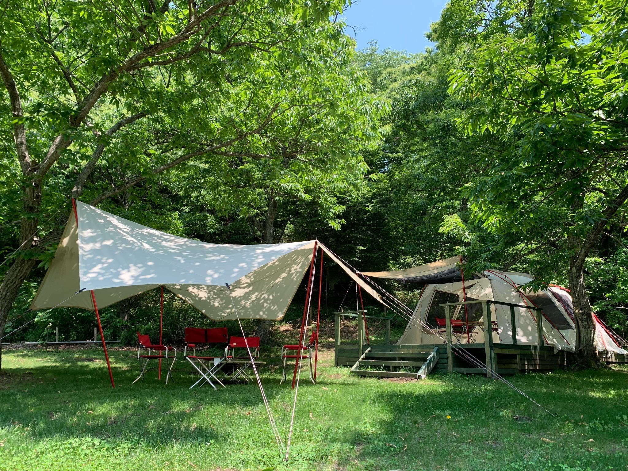 ハッシュ村は四方を山に囲まれたプライベートキャンプ場です。場内にはリノベーションした古民家があり、初めてなのに懐かしくなるような、おだやかな時間が流れています。 2千坪の敷地へ広々とテントを立てられるので、優雅で贅沢なプライベートキャンプを楽しんでみませんか? レンタル品はトップレベルの品質と人気を誇るスノーピーク用品を取り揃えていますので、初心者の方でも気軽にハイグレードキャンプをお楽しみいただけます。 芝生で開放感のあるフリーサイトと栗の木が生えている林間サイトがあります。 屋根付きBBQ棟やガス台のある炊事棟、女性の方も嬉しいシャワールームや水洗トイレも完備しています。 屋根付きBBQ棟は周囲を防虫ネットで囲んである為、雨も虫も安心の充実した設備が整っています。 近くには水深が膝下くらいで子どもでも遊びやすい清流があり、春から夏にかけては新緑に包まれ、秋には紅葉に囲まれ、一年を通して自然を満喫することができます。